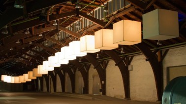 Spine is an interactive installation based on twenty glowing cubes and an atmospheric sound composition. Each cube is moved precisely in fluid motions by two computer-controlled motors. The movements of the cubes as well as the sound composition react to nearby visitors by working together as one coherent expression in dialogue with the surroundings – a fifty meter long spine floating in space continually displaying new movements, light scenes and sounds. Spine is moody: sometimes shy and avoidant at other times more curious and almost aggressive.