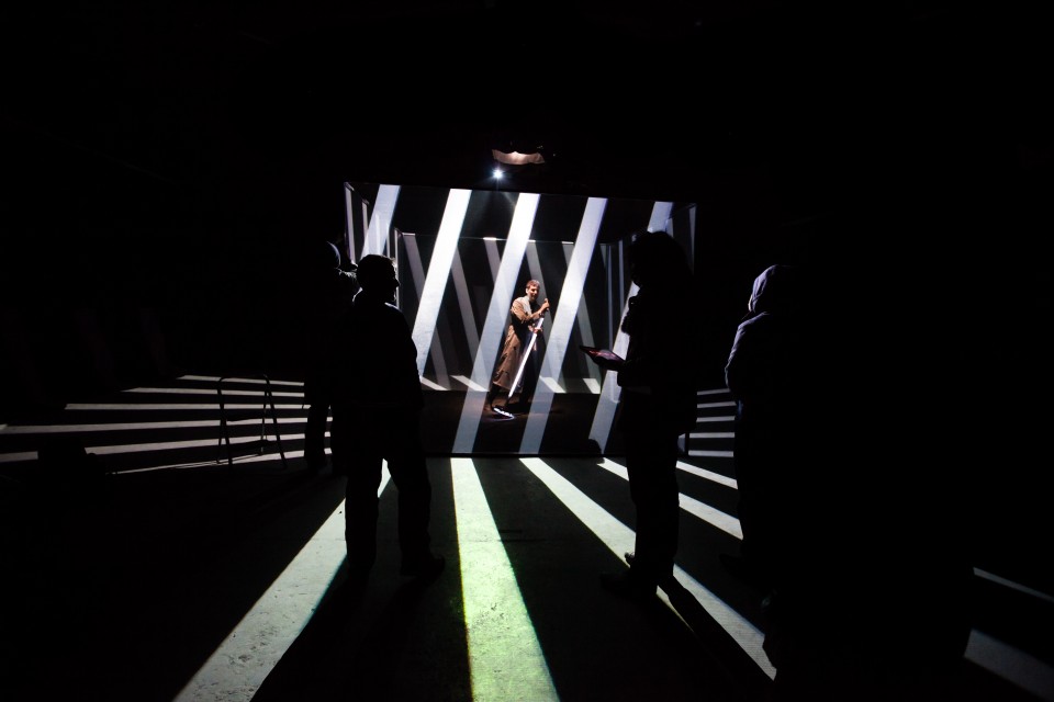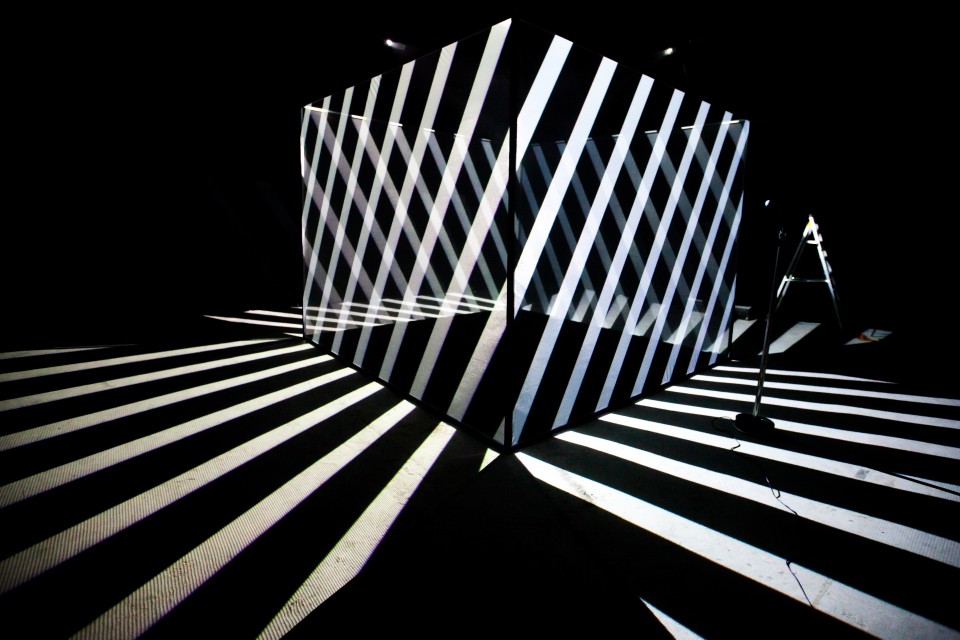 The visuals app was written in openFrameworks, based on a projection mapping system Marek Bereza (programmer) used in his previous projects. The graphics were all based on a triangulation which had a stripe texture mapped to them. All the different scenes in the videos are variations on that – it’s all the same program, but with the parameters in different positions – How big should the stripes be? How random should their orientation be? How strong should the tint colour be? etc etc.