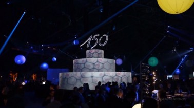 The epicentre of the party consisted in a giant three-tier cake structure upon which corporative videos, an animated video mapping and an interactive game (which also generated the musical theme of the event), were projected and alternated continually.