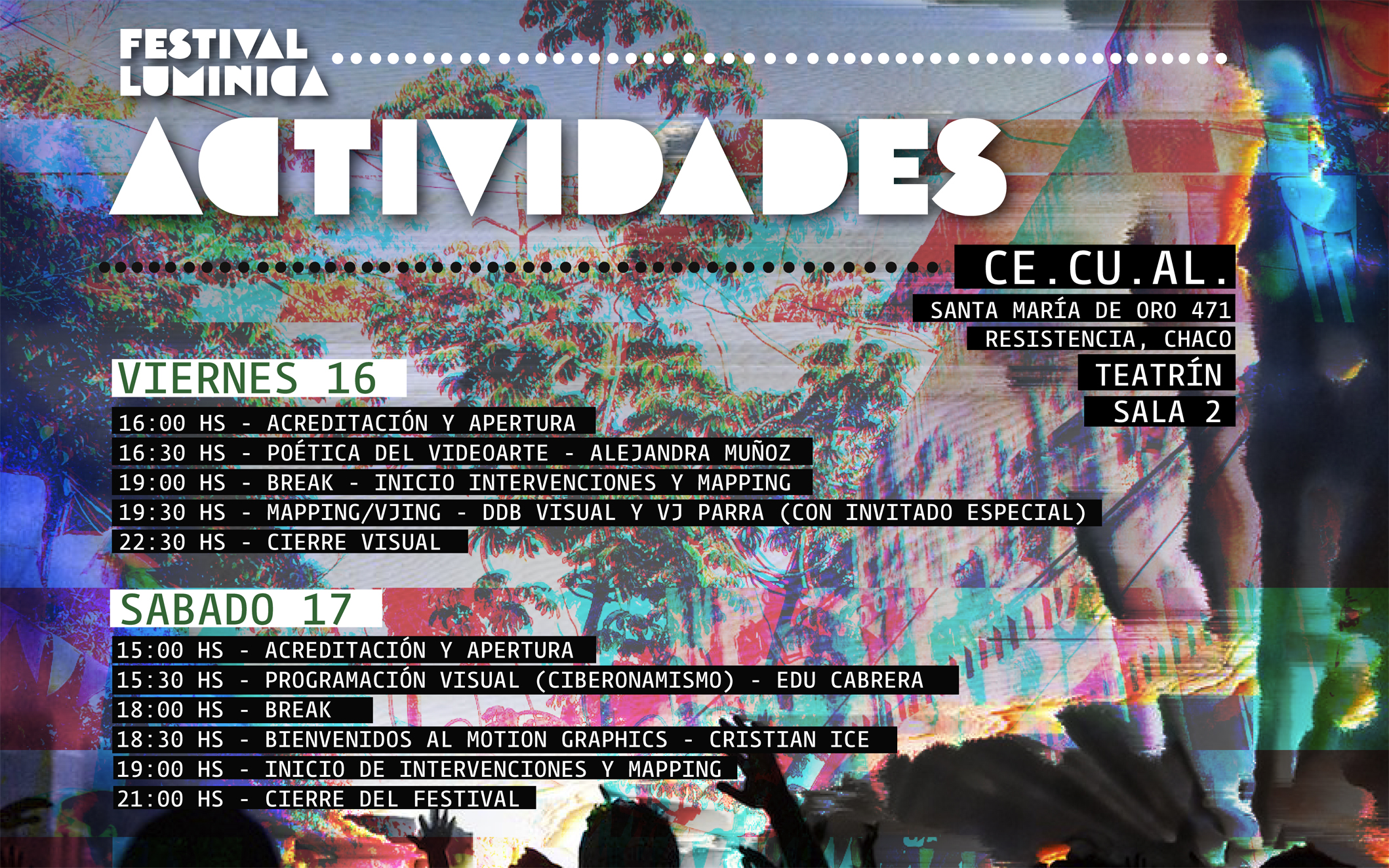 Con sus múltiples talleres, intervenciones, mappings, charlas y fiesta multimedial, Lumínica abrirá ventanas para acercarse a los procesos de la realización de materiales audiovisuales, guiados por referentes de nuestra Región. Cecual acompaña en el marco de su proyecto La Región Encendida, que “favorece la visibilidad de las producciones regionales y la creación y fortalecimiento de circuitos artísticos y culturales entre las provincias del Nea y países de la región”.