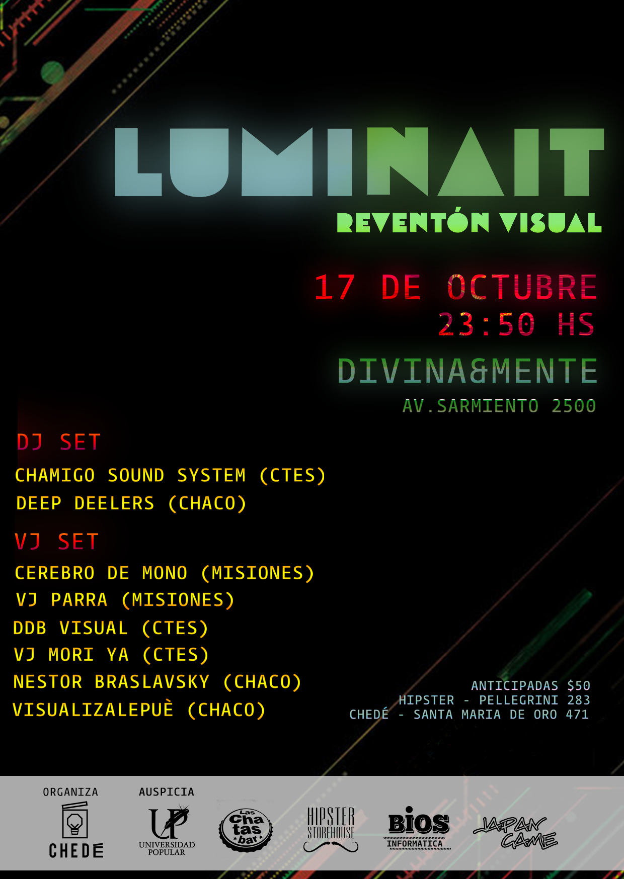 El sábado 17 será el cierre, con Luminait «Reventón Visual», la fiesta que se realizará en Divina&Mente (Av. Sarmiento 2500), de 01 a 6:30 am, con entradas anticipadas a $50, en Chede (Santa María de Oro 471) y Hipsters (Pellegrini 283).